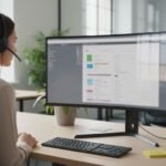 Image prompt (16:9, photo-realistic): A finance manager reviewing an invoice approval dashboard on a widescreen monitor, QuickBooks window visible on a second screen, realistic lighting, modern US office.